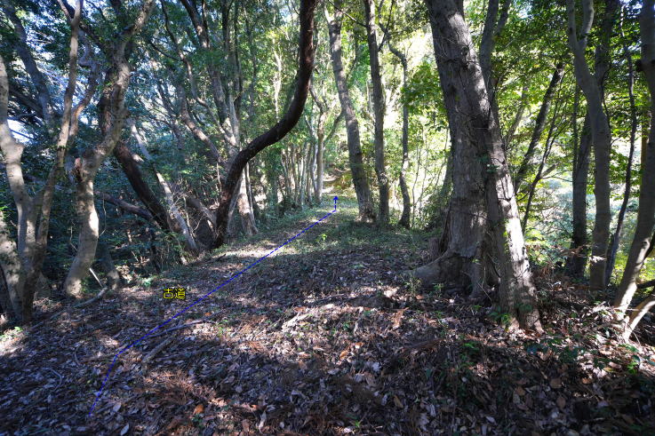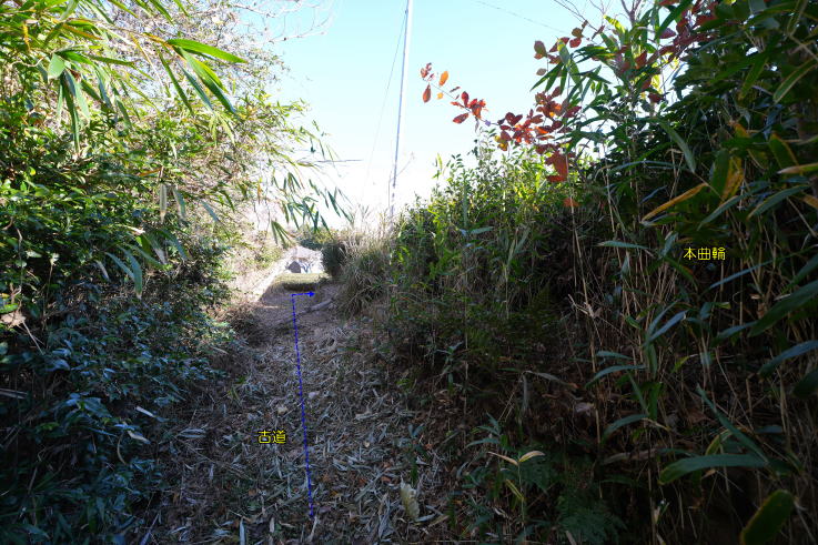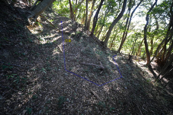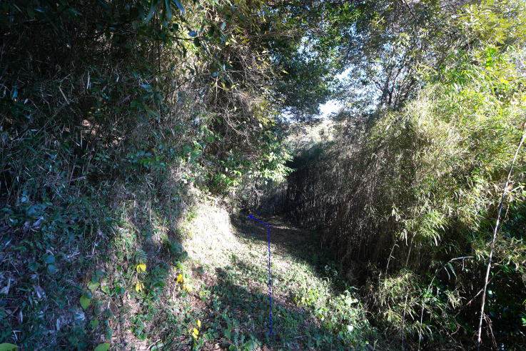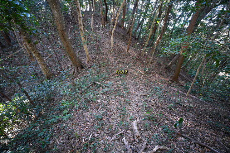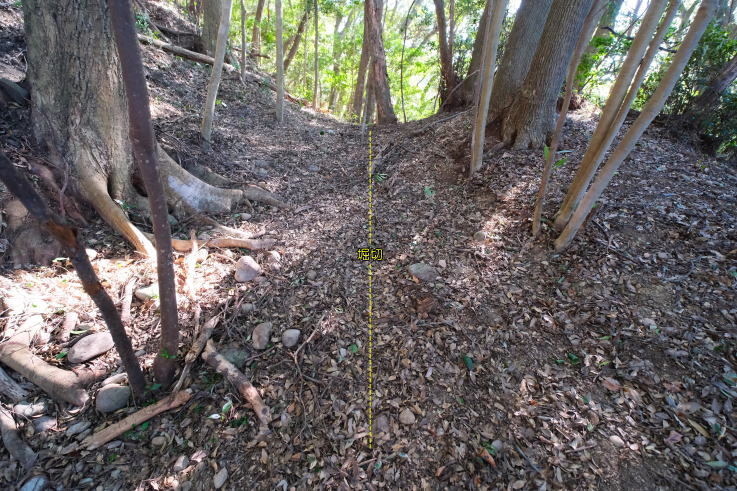 放棄地が「本曲輪」、その西側が「腰曲輪」になっています。古道の途中にあった「堀切」