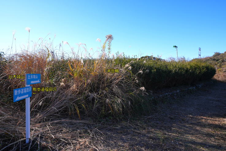 雑草が生える未舗装路を下って開けた場所に出たら、再度「比木城山」の案内看板が示す舗