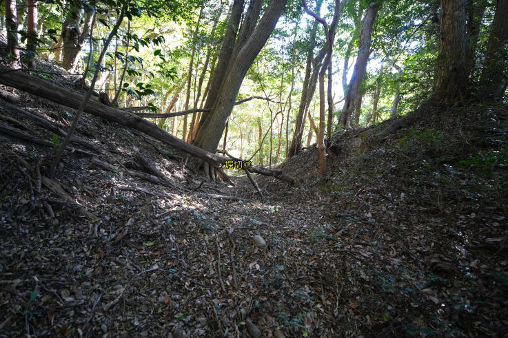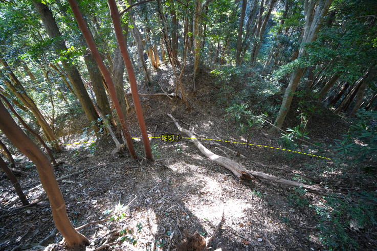 辺りから細い獣道を歩いて東へ進むと、複数の「竪堀」「堀切」が確認出来ます。