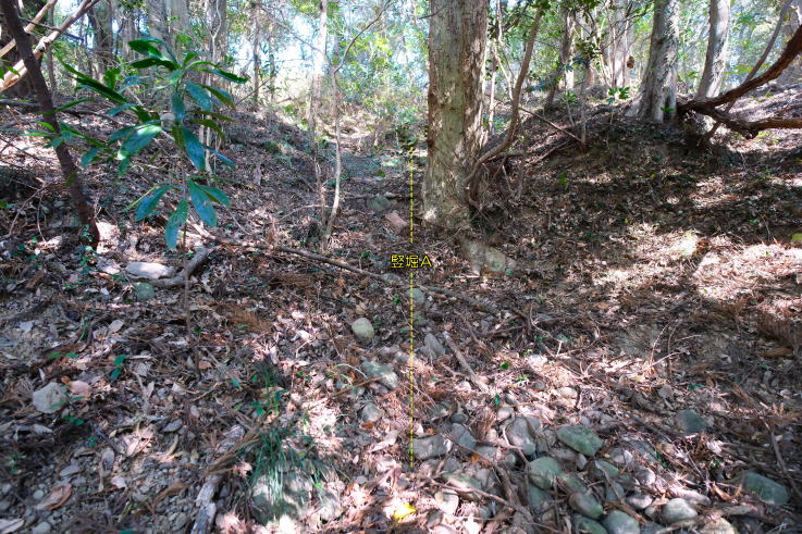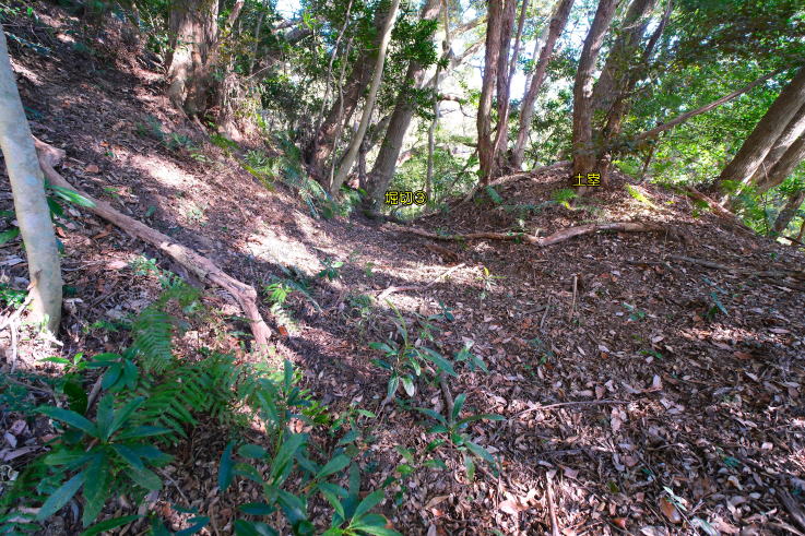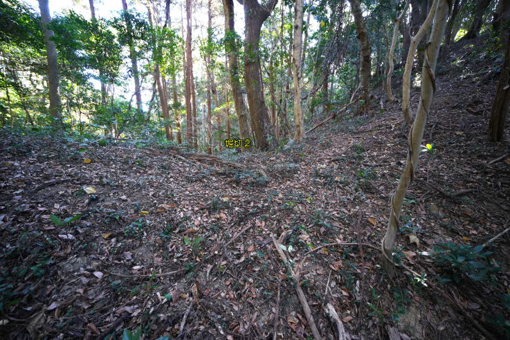 、雑木林に変わり、曲輪、堀切、竪堀が残る。
