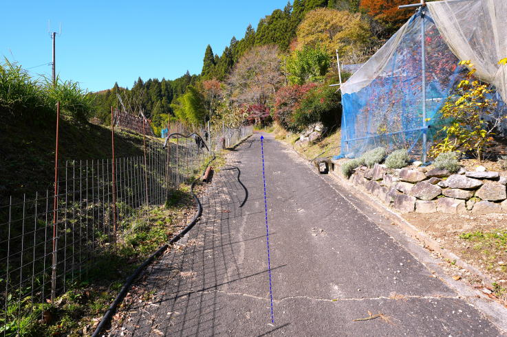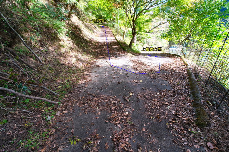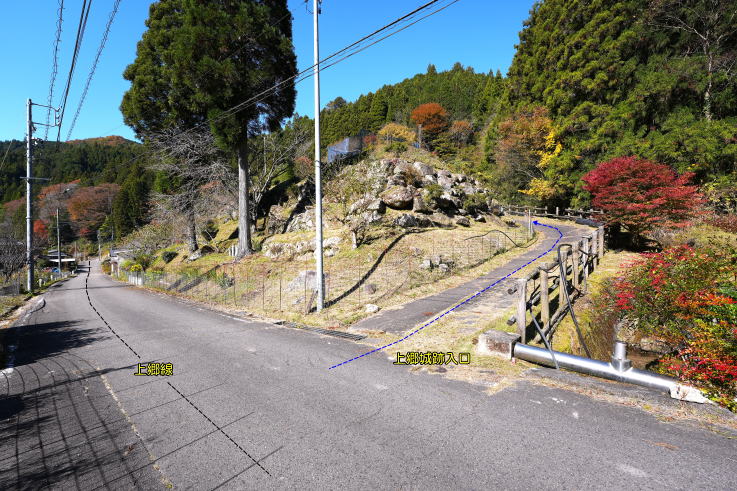 350m程走った右手の木柵がある舗装路が登城口になります。坂道を上り、右に折り返し