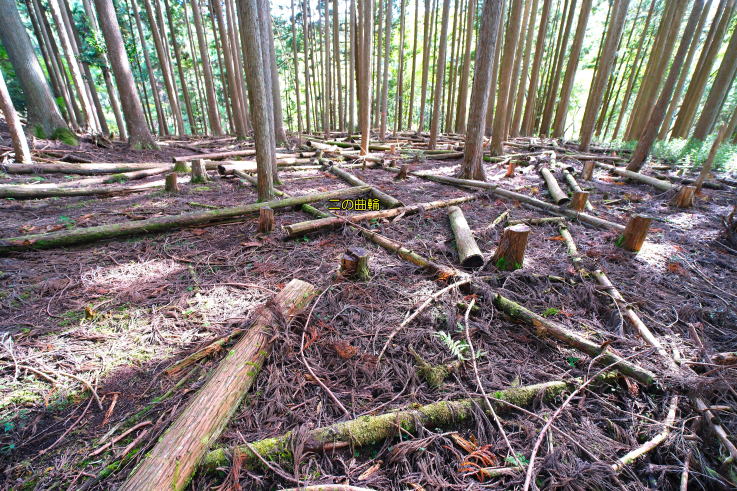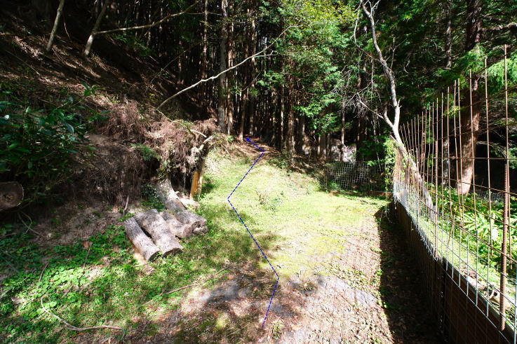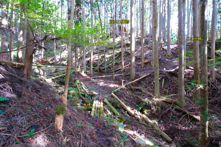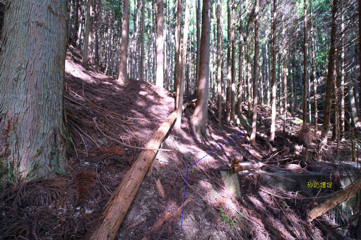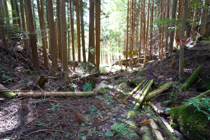 た行き止まりから山道が始まり、砂防堰堤の場所で右へ折れ、木橋を渡ってジグザグの山道