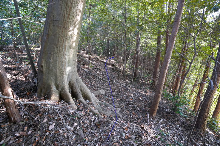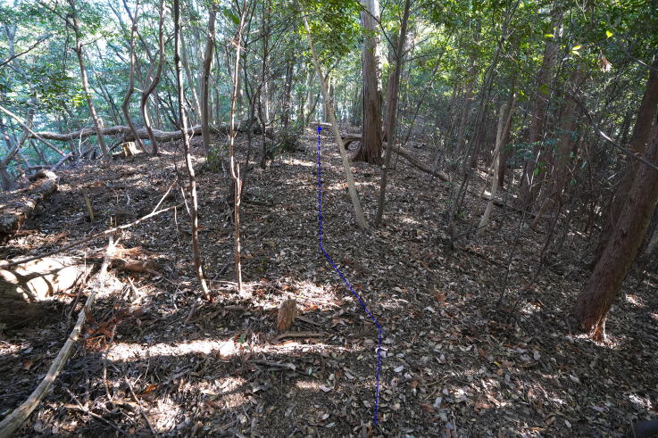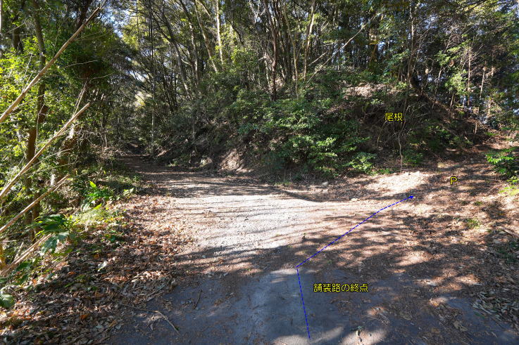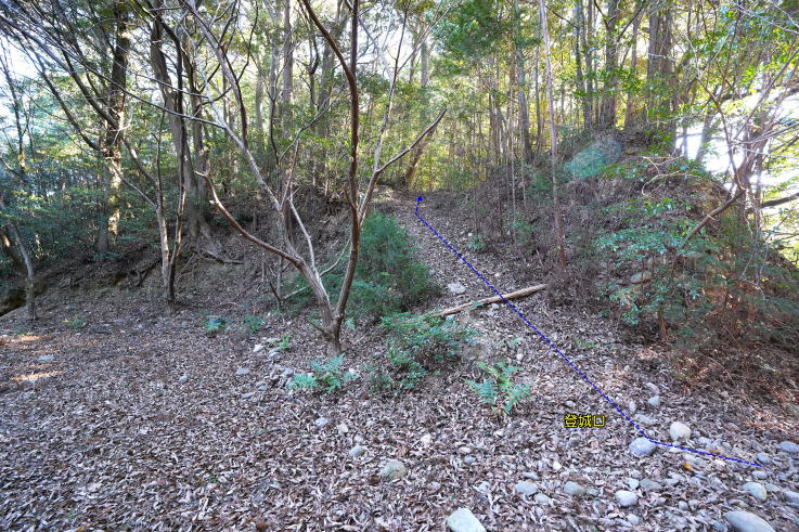 ジグザグ坂道を上り、舗装路の終点・尾根の切れ目を入った右手に登城口があります。ここ