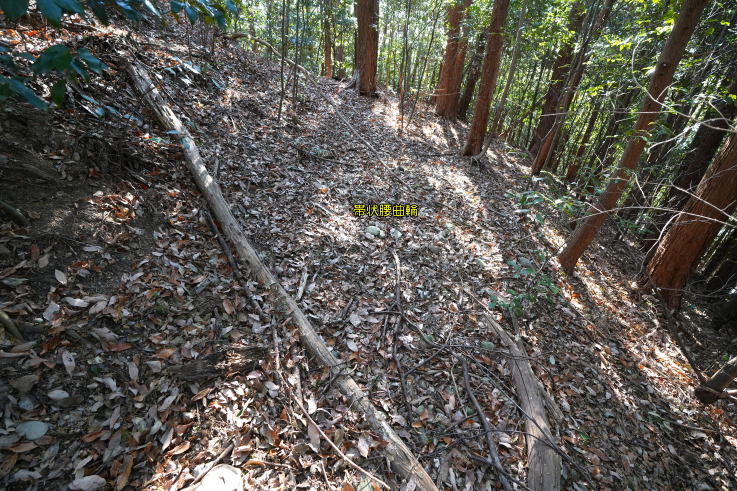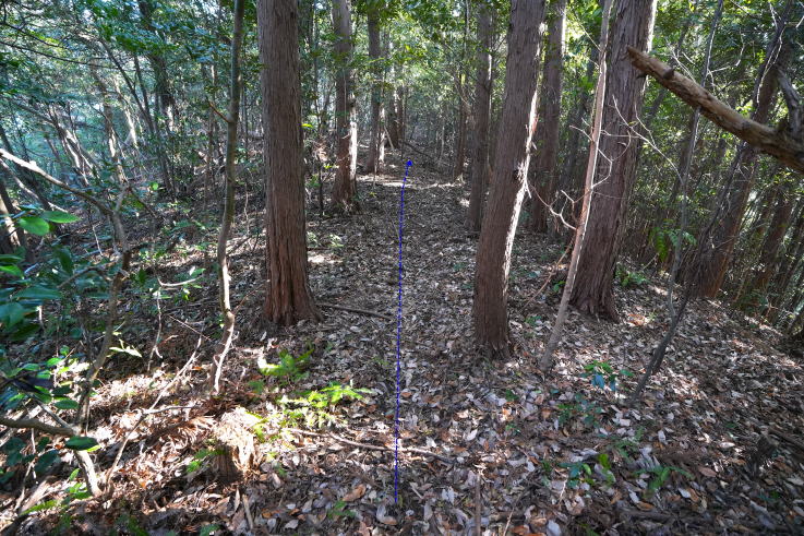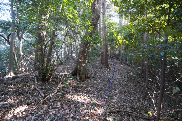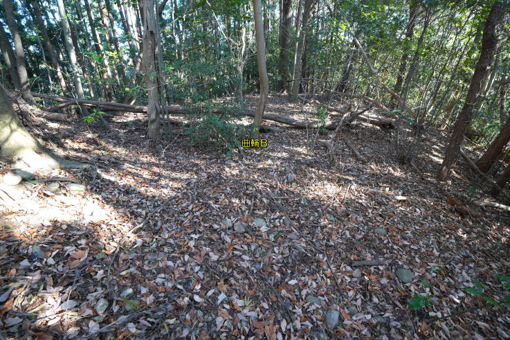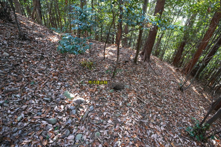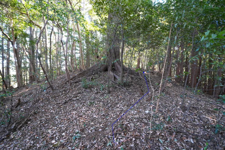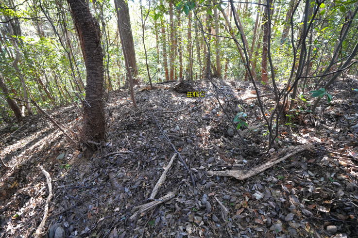 から尾根道を東へ100m程進んだ少し高くなった場所から砦跡が始まります。曲輪の配置