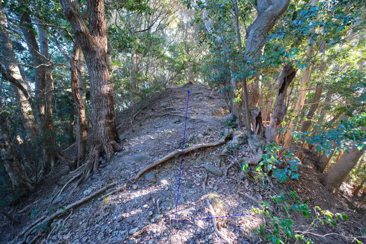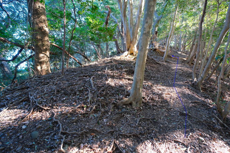 た左手に堀切、正面の尾根を上り切った場所が二の曲輪です。奥まで続く広い曲輪の先端に