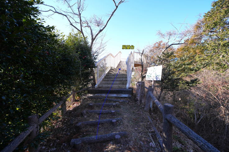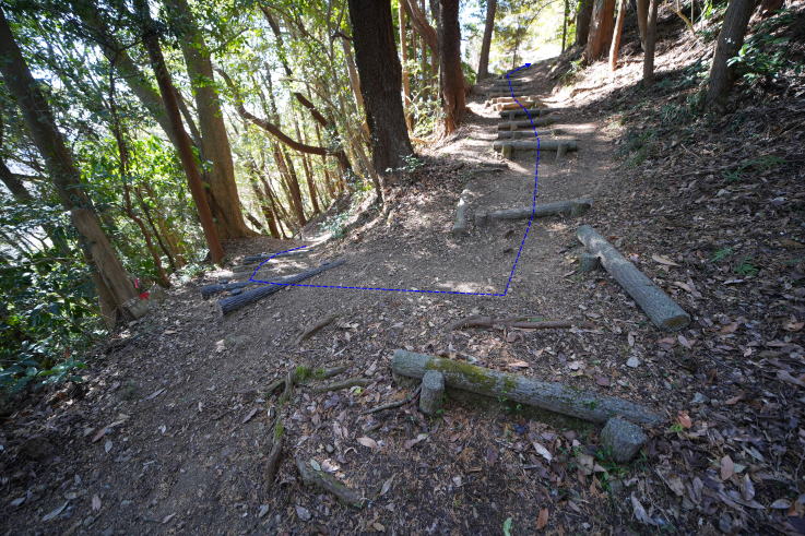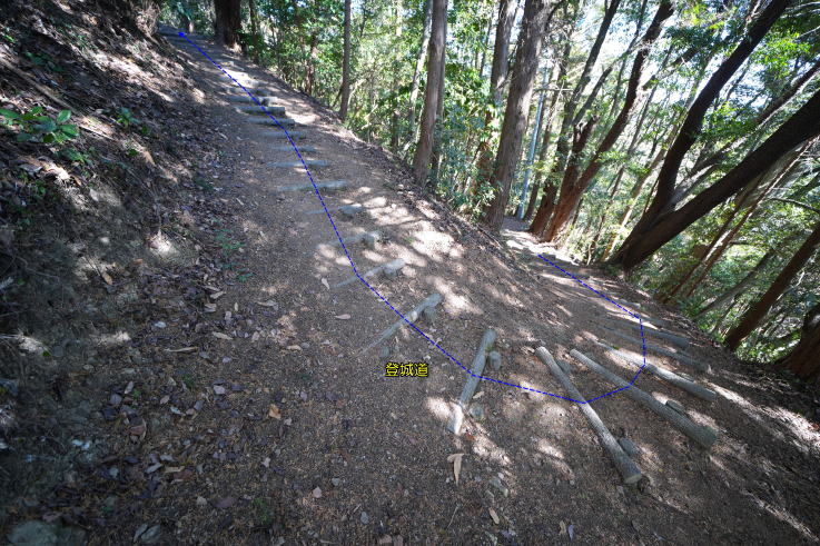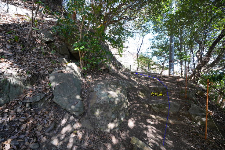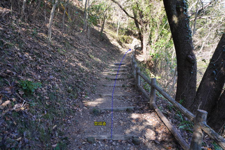 の場所が登城口。初めはつづら折りの丸太階段が続き、その後も丸太階段+山道を上り、最