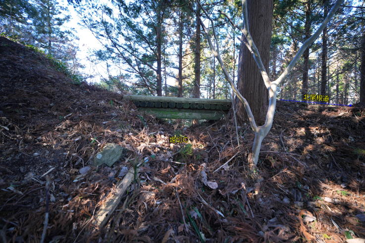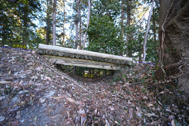 行くと、最初の木橋に堀切B、2つ目の木橋に堀切Cがあります。更に山道を進んで途中か