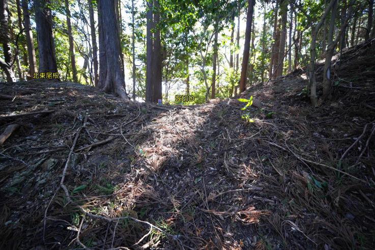 ら北尾根のピーク〔標高279m〕に乗っかり、北東の急斜面を下ると、尾根上に堀切Dが