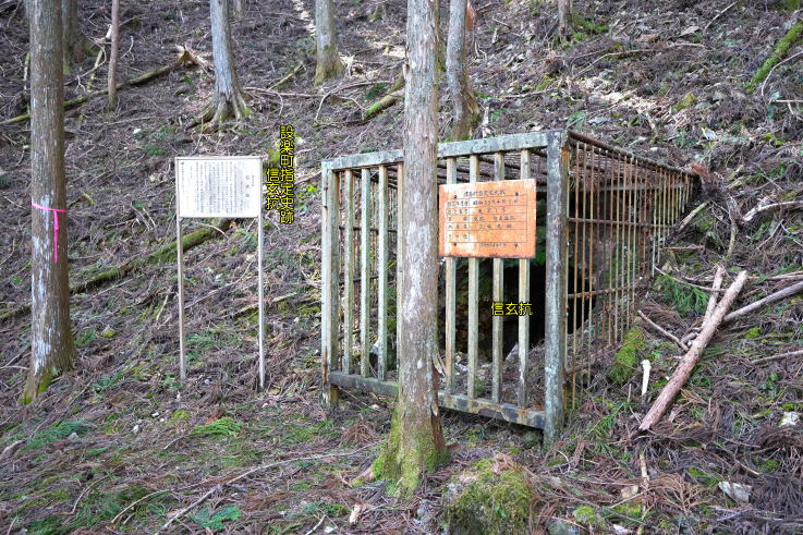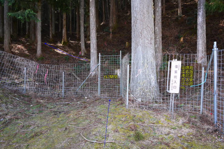 閉し、左へ90m程登った場所に「信玄坑」、頑丈な柵の奥に坑道が見えます。