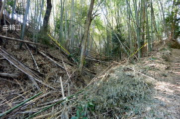 曲輪Tの西側を通る竹藪の小路〔写真:左〕曲輪V−曲輪T間の空堀〔写真:右〕
