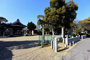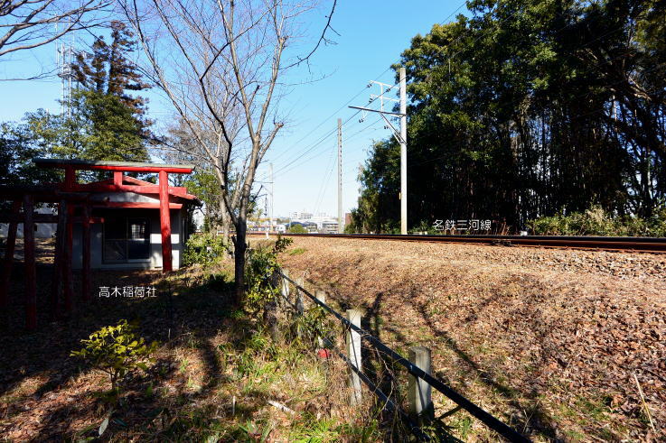 曲輪Vの中央を走る名鉄三河線〔写真:左〕中条家の氏神として建立された勝手神社〔写真:右〕