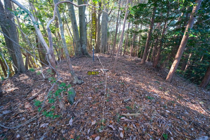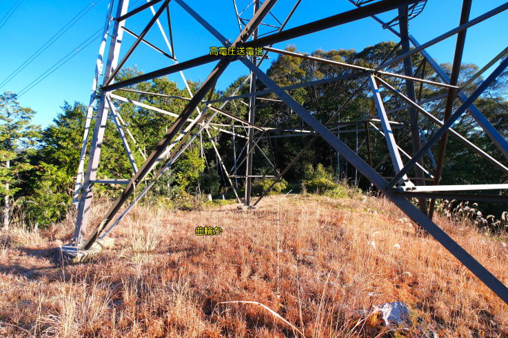手、中部電力の黄色い標柱が立っている場所〔上に階段が見える〕です。高電圧送電塔のメ