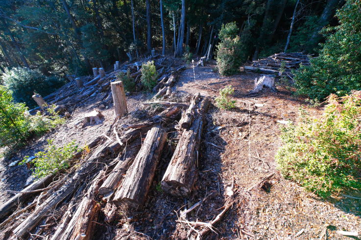送電塔が建つ開けた場所、奥の若木を掻き分けて一段下がると山林に入ります。その奥も緩