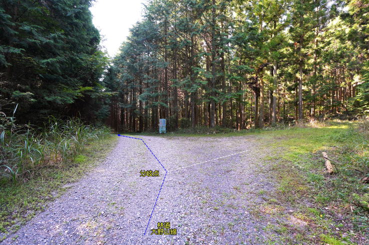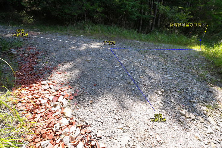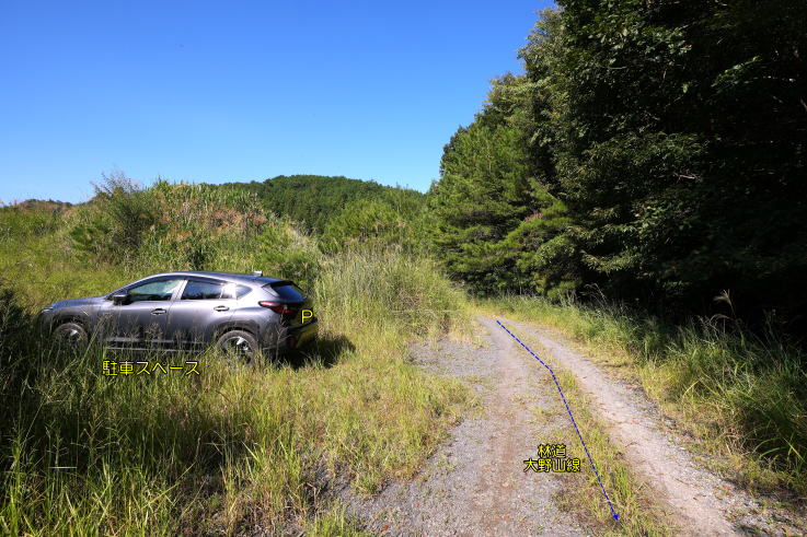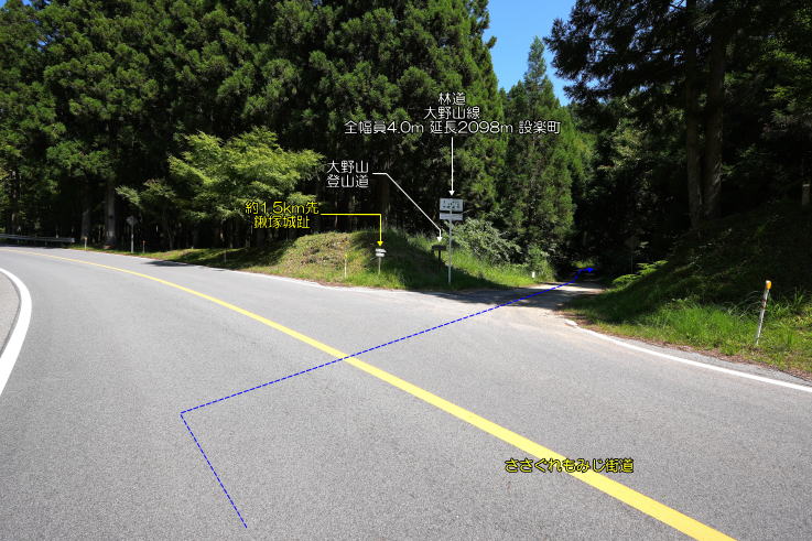 道」に入り、1.8キロ走った右手〔林道大野山線・鍬塚城址まで約1.5km先の看板〕にあ