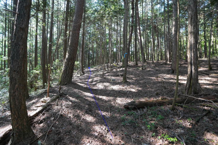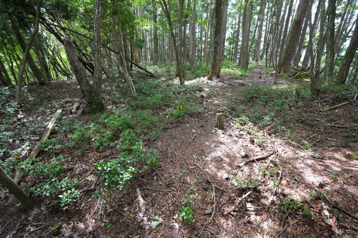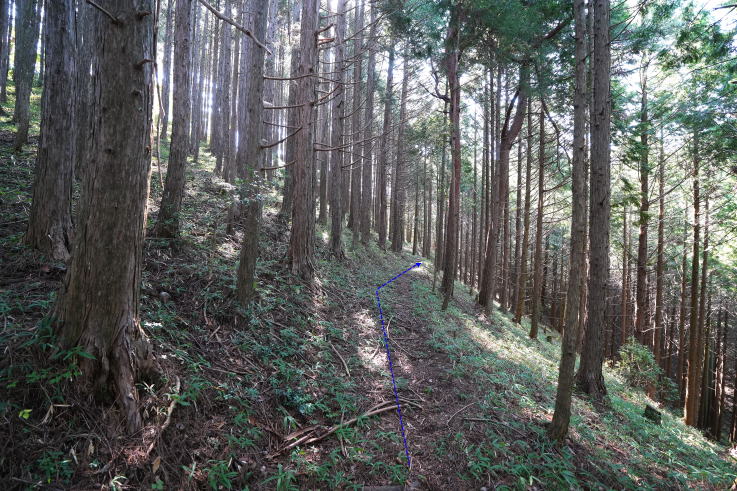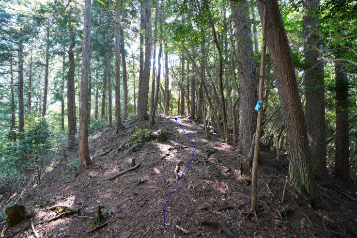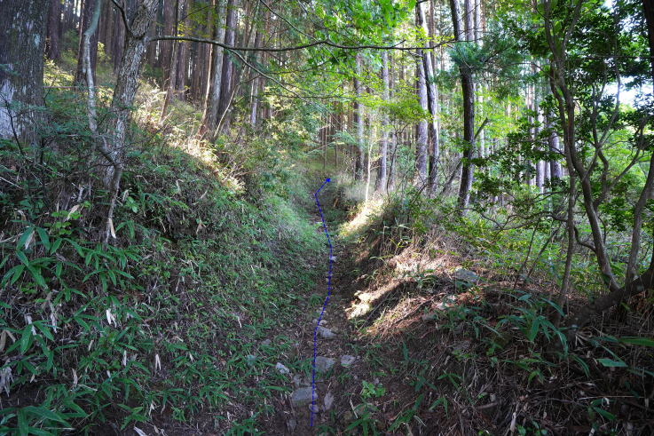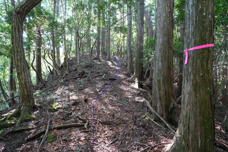 って尾根道を上って行きます。登城口から道幅1m前後の道が1km先の城跡まで続いてお