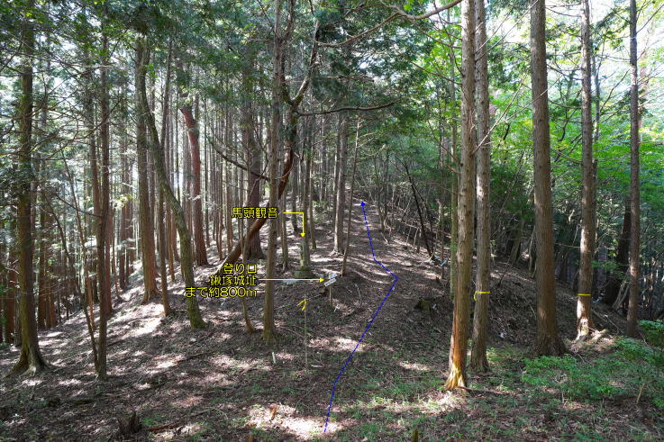 城口から200m程歩いて尾根上に登り、馬頭観音・登り口鍬塚城址の看板横から南へ向か