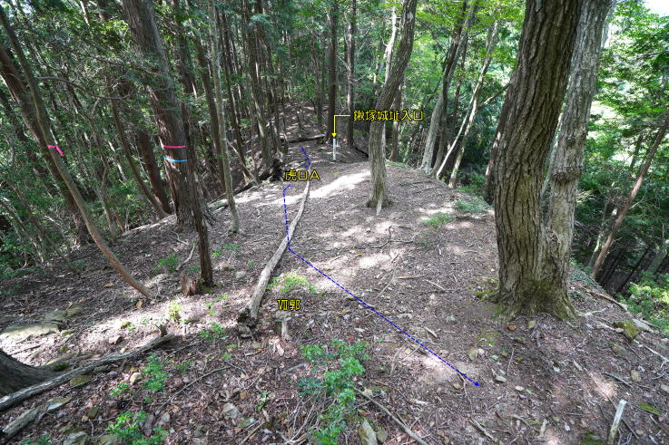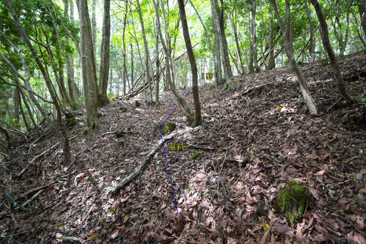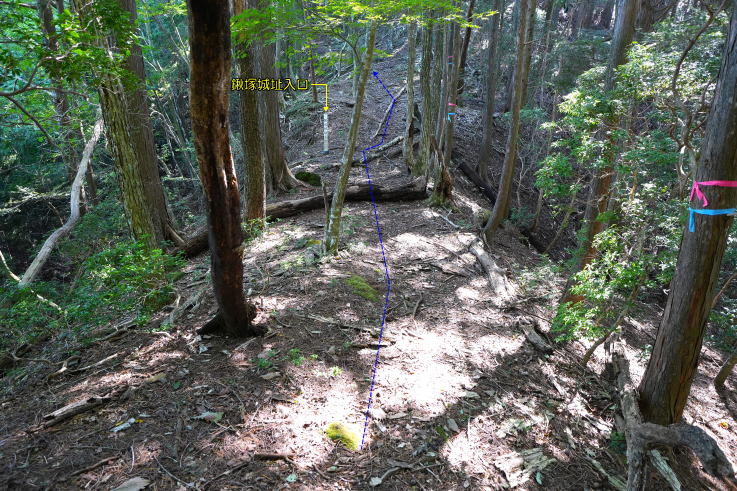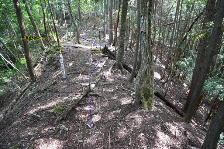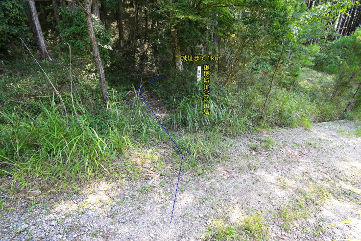 り、道も緩斜面で歩き易く、迷うことはありません。標柱「鍬塚城址入口」の場所が大手口