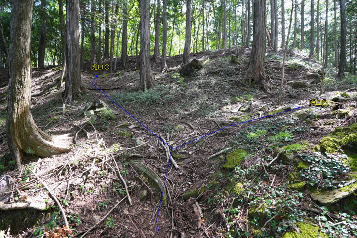 展開していますが、特に大手方面の虎口A・B・Cに対し、一二三段に配置されたY郭・[