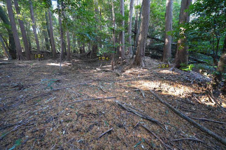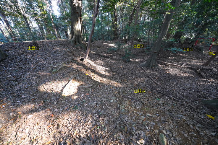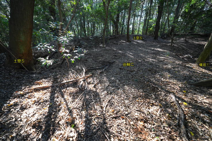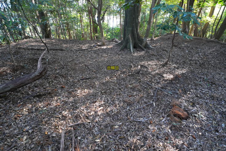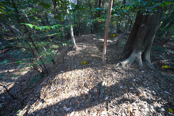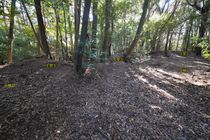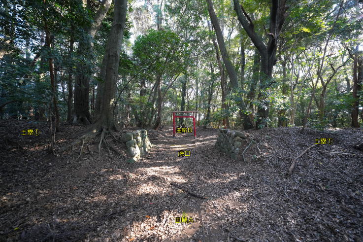 の西にL型土塁Cがあり、北へ抜ける道に折れを生んでいます。曲輪Aの虎口正面に曲輪B
