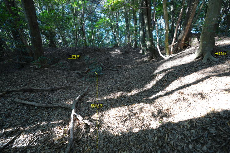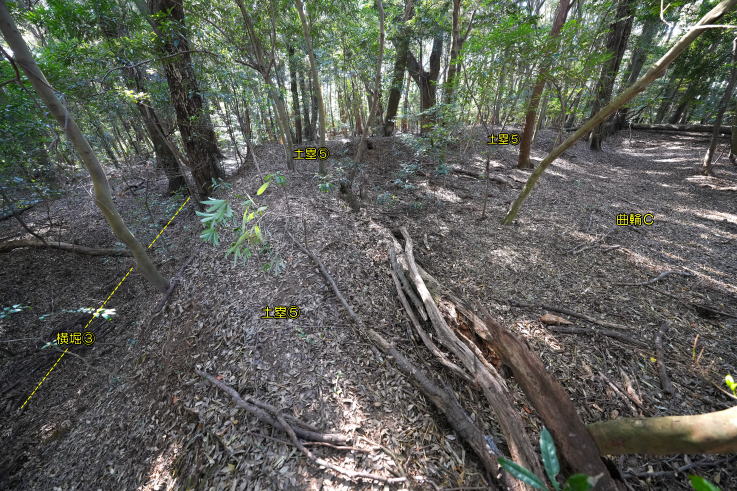 、曲輪Bを囲む横堀Bは曲輪Cにまで及び、土塁Dと共に南へ回り込んでいます。直線を基