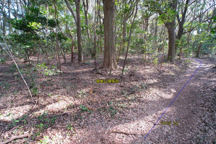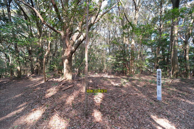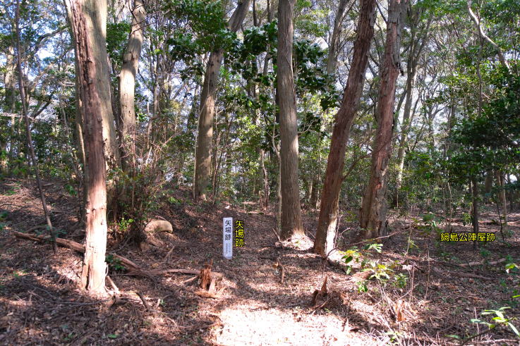 m程上ると、右手に「鍋島公陣屋跡」「土塁跡」の標柱が立ち、更に奥へ進むと「矢場跡」