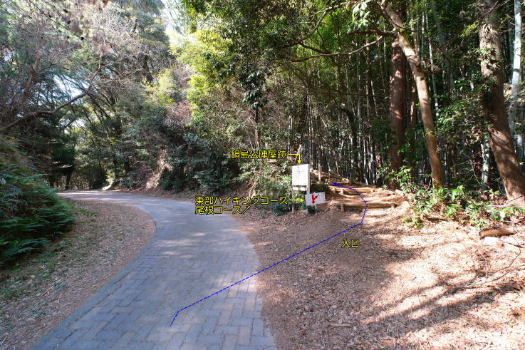 、「鍋島公陣屋跡」看板と丸太階段で分かり易くなっています。ハイキングコースを200