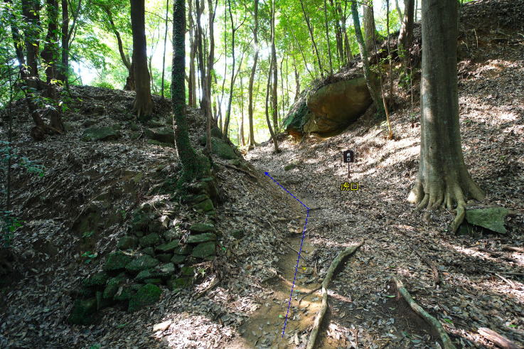 450m程上ると右手に駐車場、更に150m程進んだ右手に登城口の丸太段が在ります。