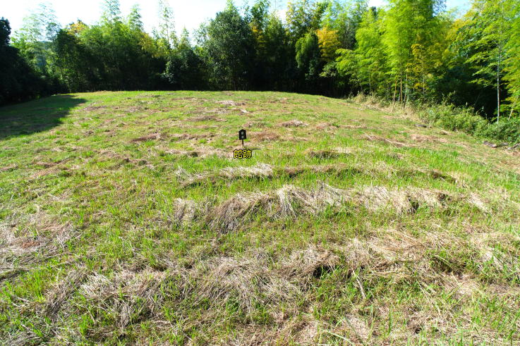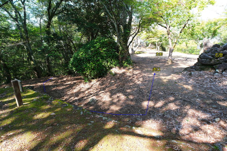 跡は最高所に主郭・二の郭、一段下った東隣りに三の郭が在ります。主郭の南方に館跡、二