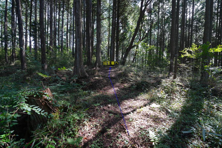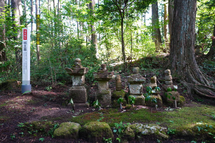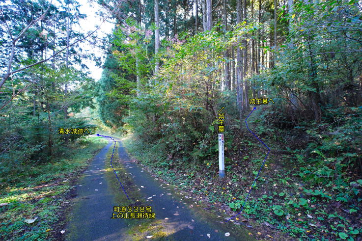 。道成りに270m程歩いた右手に「城主墓」の標柱、先へ進んだ丁字路を左折して110