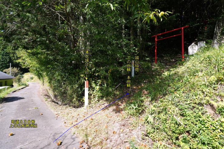 m程進んだ右手に清水城跡の入口があります。城山稲荷社へ行く丸太階段は帰り道に使うと