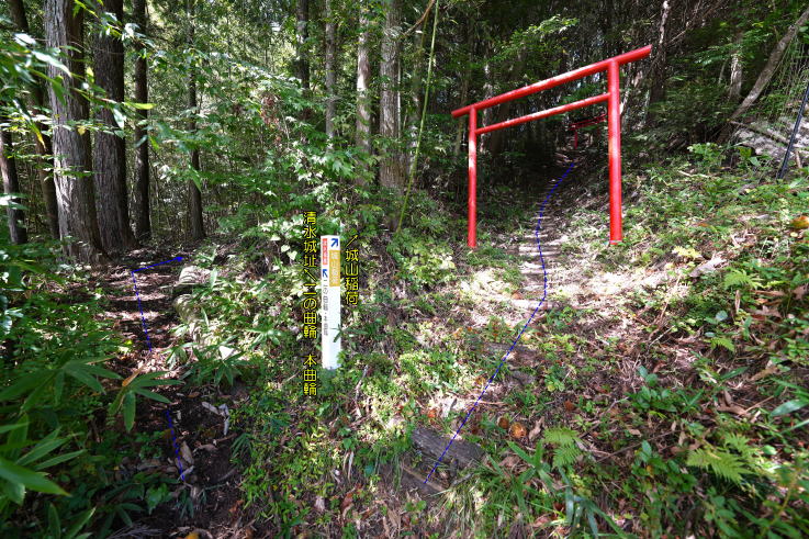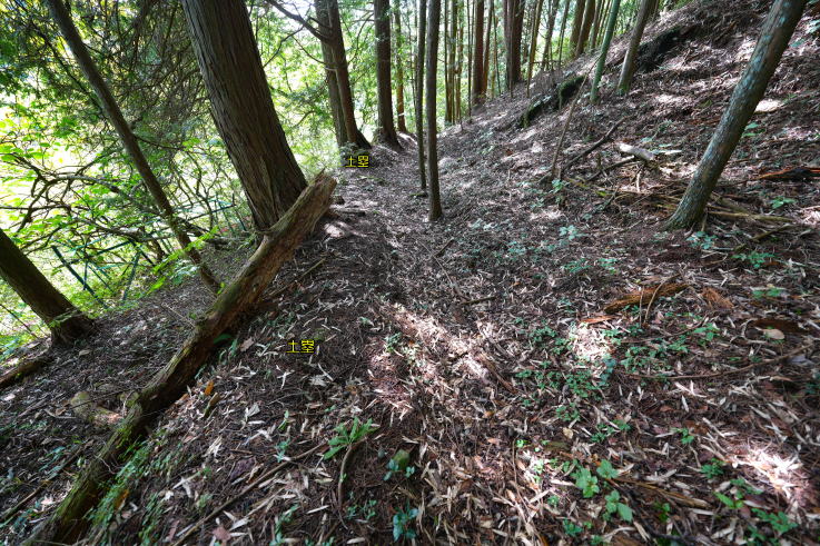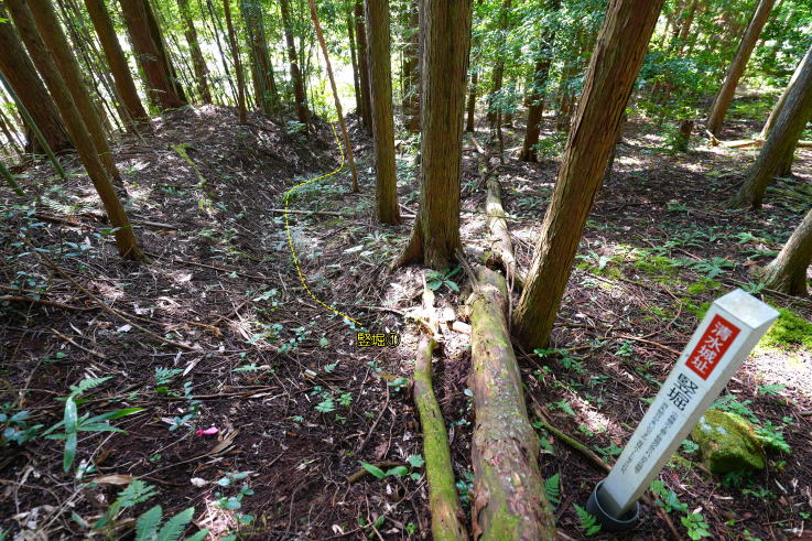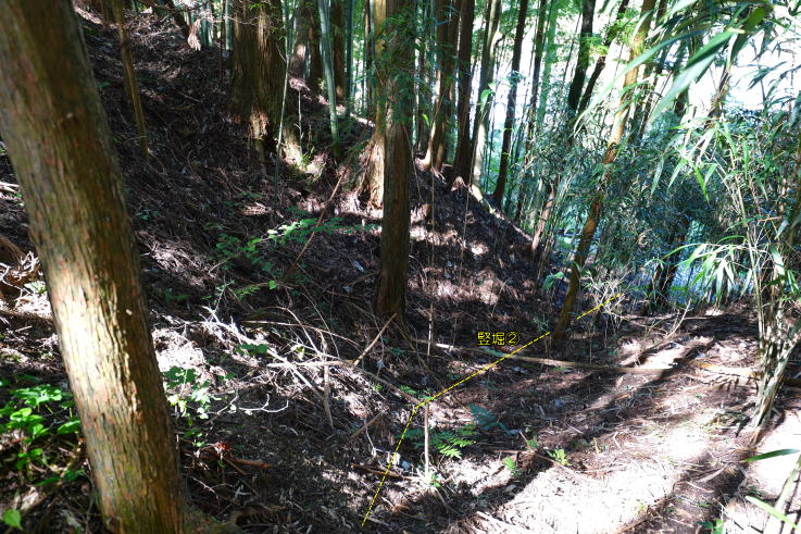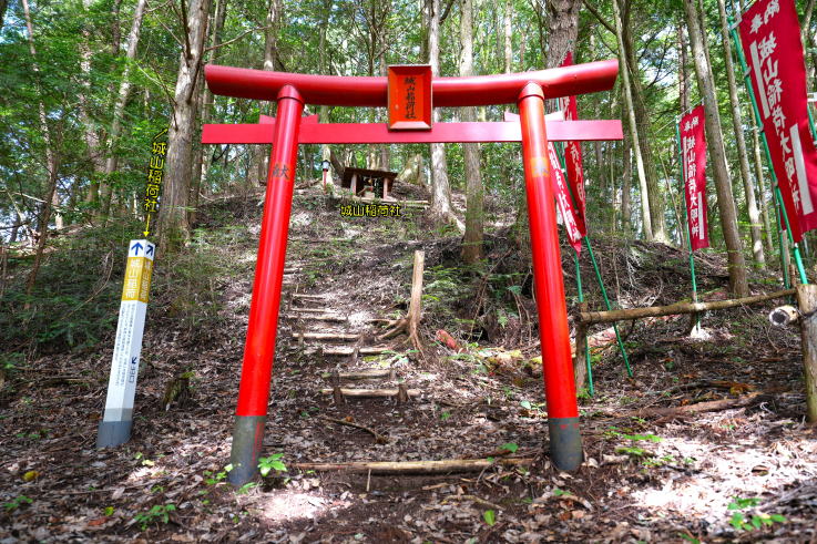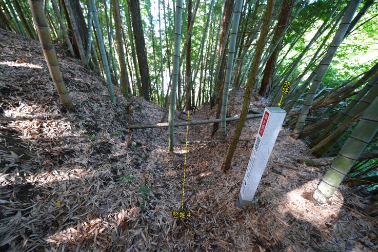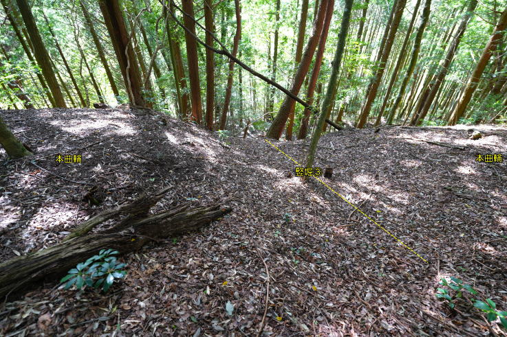 城山稲荷社、その下に土塁、本曲輪北端の搦手口を下りた場所に竪堀④、本曲輪東側に腰曲