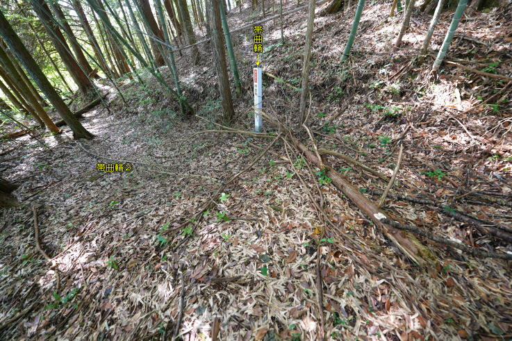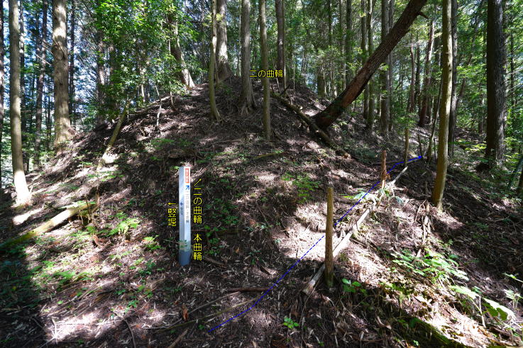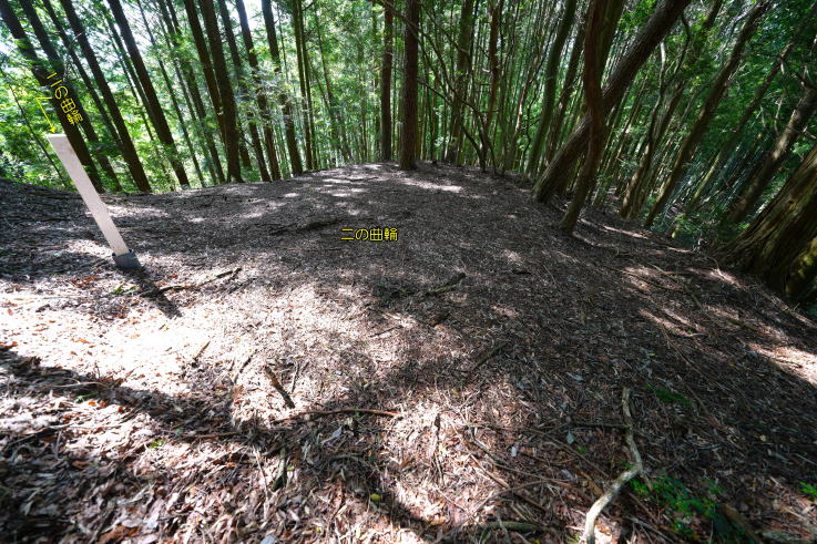 竪堀②を確認して、大手口〔↗二の曲輪・本曲輪の標柱〕から坂道を上ると、半月形の二の