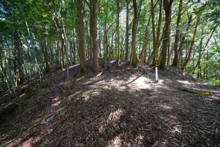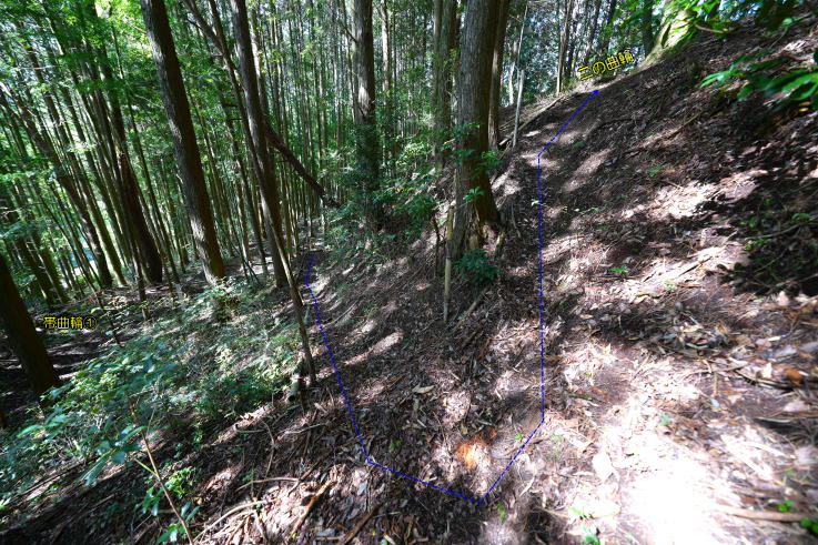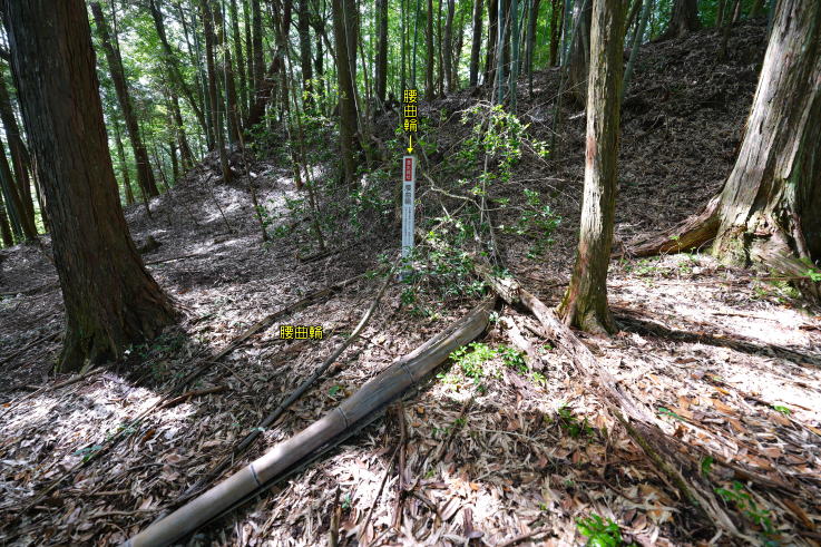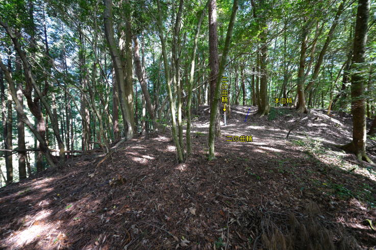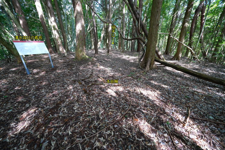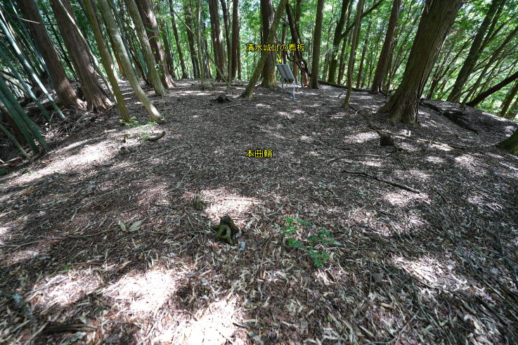 は無く、急斜面となっています。縄張り図は本曲輪の看板に描かれていますが、事前に入手