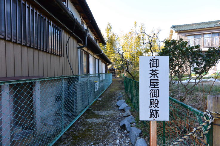 地になっており、道沿いに御茶屋御殿跡の看板、奥に祠が見えます。