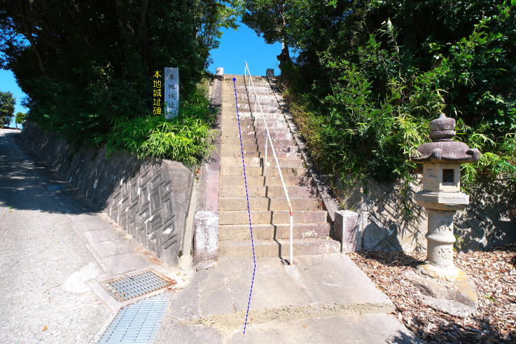 在ります。鳥居を潜って70m程進んだ正面に本地城址碑、階段を登ると八幡社です。丘陵